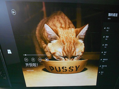 猫がご飯を食べている器に「PUSSY」という文字が。