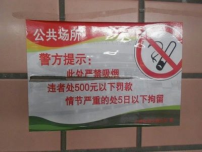 「この場所でタバコを吸ったら500元以下の罰金か5日以下の拘留」