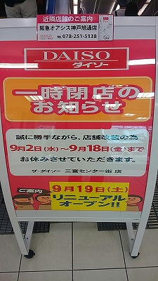 ダイソー三宮センター街店が改装のため9月2日からしばらく休業です。