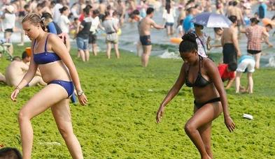 まるで芝生、海岸を埋め尽くす藻 中国