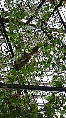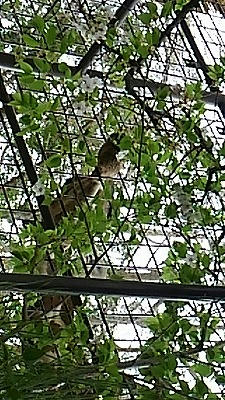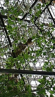 キリンが一生懸命金網から口を出して桜の葉と花を食んでいました。