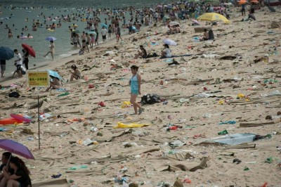 中国広東省深セン市のビーチには連休中多くの人が訪れたが、その影響でビーチには大量のごみが散乱していた。