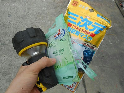 マスク、ウェットティッシュ、懐中電灯(奥様にはLEDライト)は必須。