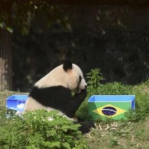 ジャイアントパンダのYing Meiは、ブラジルの国旗が描かれた箱の横に座った。同試合は3対1でブラジルが勝利した。